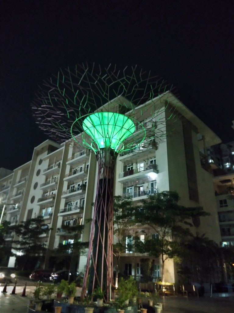 Unfortunately, this didn’t happen. Some artificial greenery was stuck on to the structure. Lights were installed in the central funnel like structure. This is how the structure looks at night from the ground.