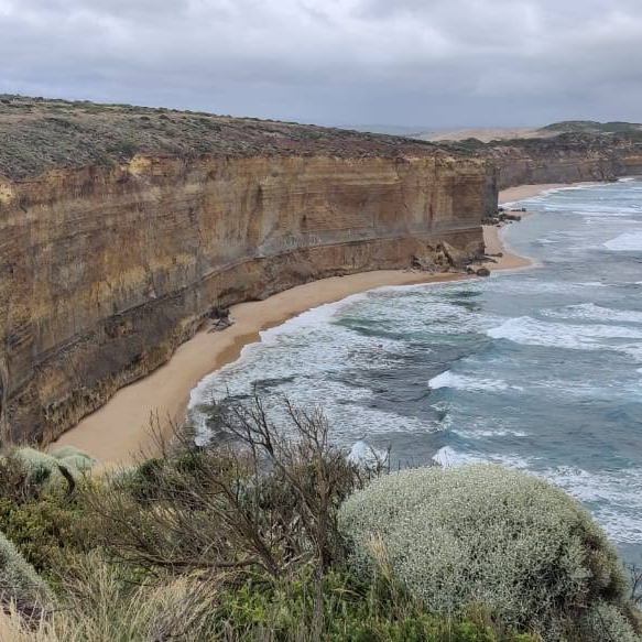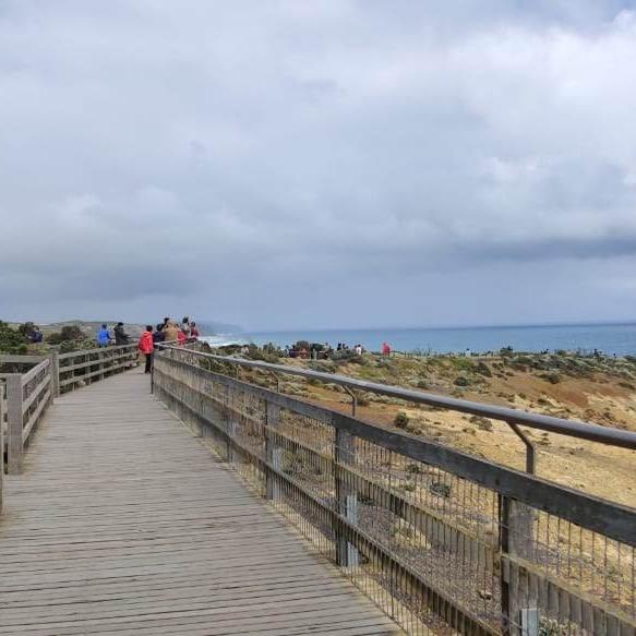 The walking track to the Twelve Apostles lookout is broad, even, and accessible to wheelchair users. The shrubbery on the sides is quite distinctive and dramatic. The track ends in a boardwalk leading to the lookout, which gets quite crowded by the time we reach there.