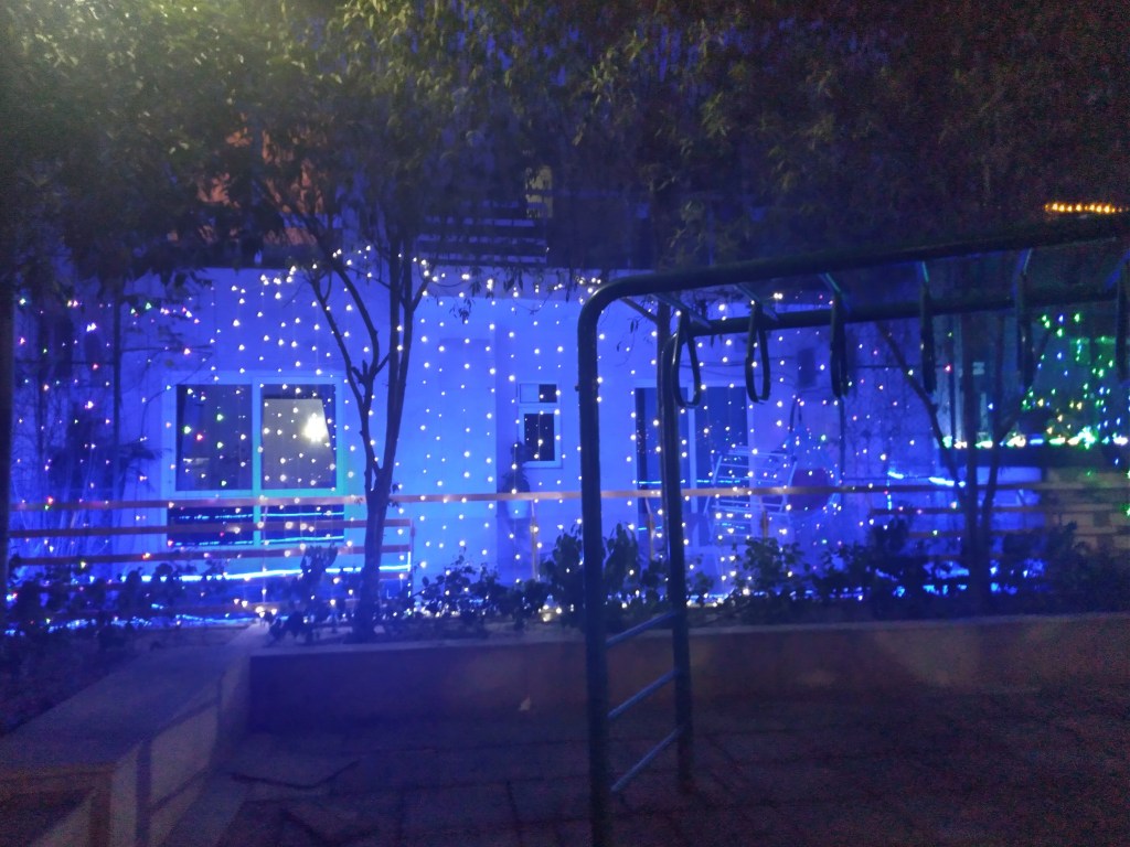 Some houses are done up tastefully, some gaudily. Some seem to have brought out all the lights the have accumulated over the years and hung them up from various corners.