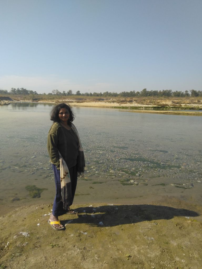 In the morning, we walked to the banks of the Kosi river down another 700-800 meter road. At this time of the year, the river had subsided and looked deceptively gentle. We have seen this river swell during the monsoons and reach the steps of the resort we were staying in at the time.